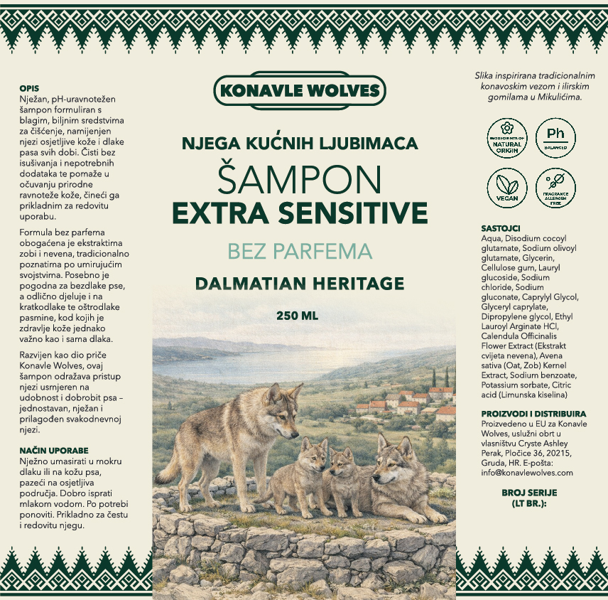 Kada sam počela razvijati proizvode za njegu pasa, željela sam stvoriti nešto što zaista odražava Konavle i dalmatinsku obalu — nešto inspirirano mjestom gdje je Konavle Wolves nastao.