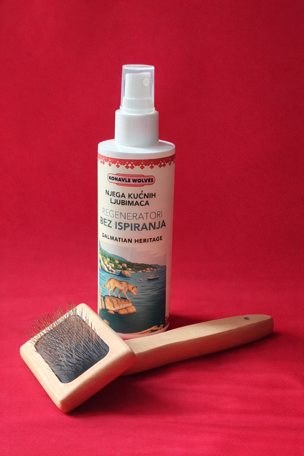 Poprskajte dlaku njegujućim sprejem, pričekajte 2 minute, zatim nježno četkajte u smjeru rasta dlake.